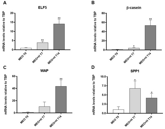 qRT-PCR analysis of ELF5 (A), β-casein (B), WAP (C) and SPP1 (D) expression in freshly isolated MEO (T0) and MEO at 7 and 14 days of culture under hormonal stimulation (H). Data (n = 3) are mean ± SEM; * p < 0.05, ** p < 0.01 compared with MEO T0. Data were analyzed using one-way ANOVA.