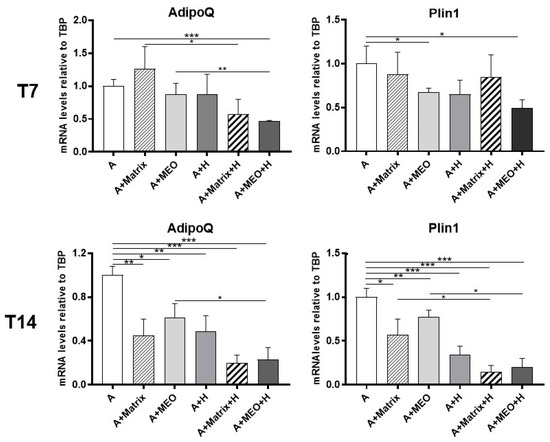 To assess whether hormone-treated MEOs can change the phenotype of differentiated adipocytes by releasing diffusible factors, we evaluated the gene expression of adipose markers in differentiated adipocytes co-cultured with hormone-treated MEOs. After 3 days of co-culture, Adiponectin (AdipoQ) and Perilipin 1 (Plin1) mRNA expression were significantly reduced in mature adipocytes co-cultured with T7-hormone-treated MEOs (A+MEO+H), highlighting that in this condition adipocytes lose some of their typical molecular signatures (Figure 3, upper panels). The reduction of the above adipose markers was even more evident after 14 days of co-culture with hormone-treated MEOs, when a significant reduction of these adipocyte markers was also detected in all the other conditions (A+Matrix, A+MEO, A+H, A+Matrix+H) (Figure 3, lower panels). This suggests that while MEO is crucial at T7, at T14 the presence of Matrigel alone also reduces the gene expression of adipocyte markers, possibly due to its content of growth factors, which are also produced by MEO (Figure S4).