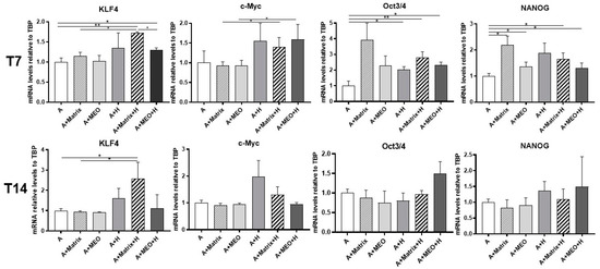 Previous data published by our group showed that adipo-epithelial transdifferentiation is accompanied by transient expression of genes typical of stem cells that are in turn involved in the reprogramming of mature cells into pluripotent cells [8]. Thus, to assess whether adipocytes reprogram their genome under our experimental conditions, we performed a gene expression analysis of the main markers of gene reprogramming, as KLF4, c-Myc, Oct3/4, and NANOG. Except c-Myc, all genes significantly increased in mature adipocytes co-cultured with T7-hormone-treated MEOs (A+MEO+H) and in the presence of Matrigel and/or hormones (A+Matrix, A+H, A+Matrix+H). In striking contrast, KLF4 was the only gene found to increase significantly at T14 specifically in the condition with Matrigel and hormones (A+Matrix+H) (Figure 4).