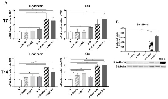 Similar data were obtained at T14, further confirming the involvement of MEOs, Matrigel, and hormones as factors contributing to the increase in gene expression of epithelial markers (Figure 5A, lower panels).