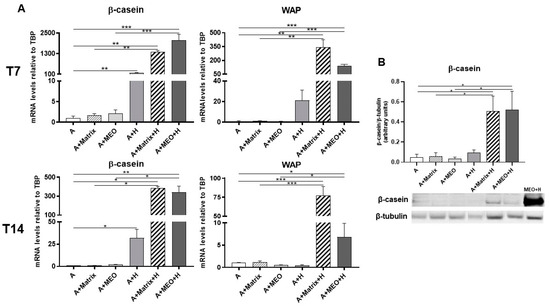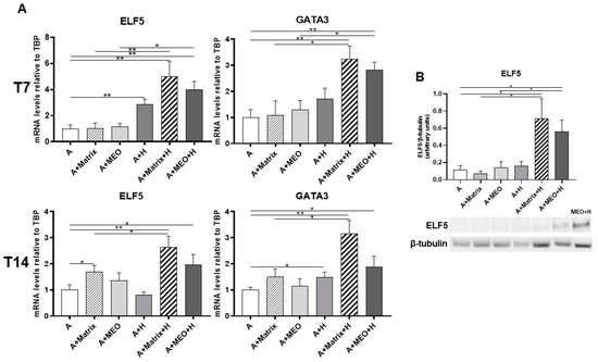 Lastly, we assessed whether adipocytes co-cultured with hormones and MEOs express molecular signatures of mammary alveolar epithelial cells. We thus performed a gene expression analysis of typical markers of early lactogenesis, ELF5 and GATA3, and of late lactogenesis, β-casein and WAP. ELF5 and GATA3 mRNA significantly increased in adipocytes treated with hormones and in adipocytes co-cultured with T7 and T14-differentiated MEOs and hormones (Figure 6A). ELF5 and GATA3 gene expression also increased in all the other conditions (A+Matrix, A+H, A+Matrix+H).