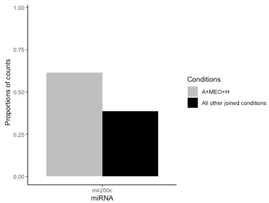 Bar plot of mir200c miRNA (x-axis) representing the proportions of counts specific to the considered conditions: A+MEO+H and All other joined conditions (A, A+H, A+MEO, A+Matrix, A+Matrix+H) (y-axis).