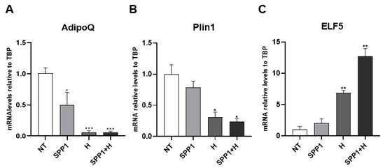 qRT-PCR analysis of AdipoQ (A), Plin1 (B) and ELF5 (C), in hMADS adipocytes maintained for 24 h under osteopontin 500 ng/mL (SPP1), pregnancy hormones (H) and H+SPP1. Data (n = 3) are mean ± SEM; * p < 0.05, ** p < 0.01, *** p < 0.001 compared with untreated hMADS adipocytes (NT). Data were analyzed using one-way ANOVA.
