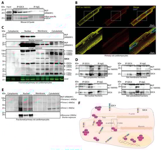 Syndecan-4 binds to MLP in nuclear-enriched fractions of rat primary cardiomyocytes. (A) Immunoprecipitation using anti-syndecan-4 (KY/8.2) in adult WT mouse LV lysates. Co-precipitation of MLP was detected with a custom-made antibody against the C-terminal region of MLP (specificity shown in Supplementary Figure S1A). Non-relevant rat IgG was used as a negative control (n = 3 mouse hearts). Syndecan-4 and non-specific precipitation are indicated by arrows on the right. Lysate input is shown on the left. (B) Representative immunofluorescence of MLP (yellow) and α-actinin (red) in freshly isolated adult rat primary cardiomyocytes. The cell nucleus was stained with DAPI (cyan). Negative control images are shown in Supplementary Figure S3A. (C) Immunoblot of MLP and syndecan-4 (SDC4) in enriched subcellular fractions of adult rat cardiomyocytes. A longer exposure image of the monomeric form of MLP is shown in the second panel down. Syndecan-4 positive bands are annotated with the approximate molecular weight on the right with arrows (specificity of bands are shown in Supplementary Figure S1F) (n = 3 rat hearts). Licor was used to show equal protein loading within fractions (20 µg). Subcellular compartment markers are shown in Supplementary Figure S1G. (D) Immunoprecipitation using anti-syndecan-4 (KY/8.2) in cytoplasmic-, nuclear-, membrane-, and cytoskeletal-enriched fractions of adult rat cardiomyocytes. Co-precipitation of MLP was detected with a custom-made antibody against the C-terminal end of MLP. Non-relevant rat IgG was used as a negative control (n = 3 rat hearts). (E) Immunoblotting of MLP under native conditions in cytoplasmic-, nuclear-, membrane-, and cytoskeletal-enriched fractions of adult rat primary cardiomyocytes (n = 3 rat hearts). A shorter exposure image of the monomeric form of MLP is shown in the lower panel. Interpreted oligomers and the approximate molecular weights are annotated on the right with arrows. (F) An illustration of the localization of syndecan-4 and MLP and their interaction in an adult rat cardiomyocyte, as identified in (B–E).