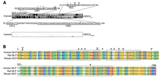 We next aimed to identify the syndecan-4-MLP-binding domain(s). A biotinylated peptide covering the cytoplasmic domain of syndecan-4 (SDC4cyt) was overlaid onto 20’mer overlapping peptides covering the full length of human MLP. Biotinylated SDC4cyt bound to three sequences on human MLP; 28-RSFHKTCFHCMACRKALDSTTVAAHESEI-56, located in the LIM1 domain, 61-CYGRRYGPKGIGYGQGAGCLSTD-83, covering the nuclear localization signal (NLS) of MLP (in bold) [40] and 97-KPARSVTTSNPSKFTAKFGESEKCPRCGKSVYAAEKVMGGGKPWHKTCFRCAICGKSLESTNVTDKDG-164, partially covering the cofilin-2 (CFL2) and LIM2 domains (Figure 2A, upper panel). Importantly, control scrambled peptides, biotinylated SDC4scram, did not recognize any human MLP sequence (Figure 2A, lower panel). The protein sequence alignment of mouse, rat, and human MLP showed that the amino acids within the three SDC4cyt binding sites were almost identical across the three species (Figure 2B). In an ELISA-based assay, using wells coated with 30 amino acid-long overlapping MLP peptides, biotin-SDC4cyt binding was confirmed with four MLP peptides covering the same sequences, namely amino acids 25–54, 50–79, 100–129, and 125–154 (Figure 2C).