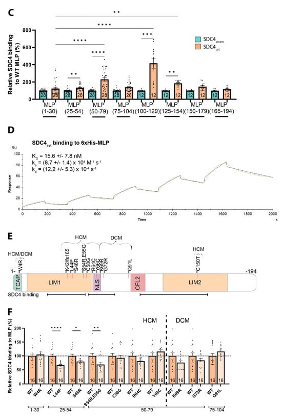 Syndecan-4 binds to multiple sites in MLP. (A) Human MLP-WT was synthesized as 20’mer overlapping peptides with 3 amino acids offset on a membrane and overlaid with a biotinylated SDC4cyt peptide (upper membrane). An identical membrane overlayed with a biotinylated SDC4scram peptide was used as a negative control (lower membrane) (n = 3). Boxed regions indicate the strongest syndecan-4 binding sites in MLP-WT, annotated with corresponding amino acid sequences. Specific domains are underlined and known human mutations in MLP are in bold and annotated with a star (HCM-associated) or triangle (DCM-associated). (B) Protein sequence alignment of human, rat, and mouse MLP (color by chemistry) shows almost complete sequence similarity across species. SDC4cyt binding domains identified in (A) are annotated with boxes, and known human MLP mutations are annotated with a star (HCM-associated) or triangle (DCM-associated). (C) An ELISA-based assay coated with overlapping MLP-WT peptides (annotated beneath the graph) overlayed with SDC4cyt or SDC4scram peptides (n = 12–28). All values are presented as mean percentages ± SEM where SDC4cyt was normalized to a corresponding SDC4scram control peptide (set to 100%). (D) SPR analyses of syndecan-4 and MLP were conducted by immobilizing biotin-ahx-SDC4cyt on an SA chip. The response was measured while injecting a range of concentrations of recombinant 6xHis-MLP-WT. The green curve shows the experimental data, and the black shows the mathematically modeled fit (n = 4). (E) An illustration of known MLP binding domains and mutations known to associate with the HCM or DCM phenotype in humans, located mainly in the LIM1 and NLS regions of MLP. The syndecan-4 binding domains identified in (A,C) are annotated beneath the illustration. (F) An ELISA-based assay coated with 30 amino acid-long MLP-WT or mutated MLP peptides overlayed with SDC4cyt or SDC4scram (n = 16). Values are presented as mean percentages ± SEM where SDC4cyt peptides were normalized to the corresponding SDC4scram peptides. MLP mutated peptides were then related to the MLP-WT peptide (set to 100%, dashed line). Differences between SDC4cyt and SDC4scram, and MLP-WT and MLP mutations were tested with a Kruskal–Wallis test with Dunn’s multiple comparisons (C) and Mann–Whitney U tests (F), respectively, due to non-normal distribution analyzed by Shapiro–Wilk testing (* p < 0.05, ** p < 0.01, *** p < 0.001, **** p < 0.0001).