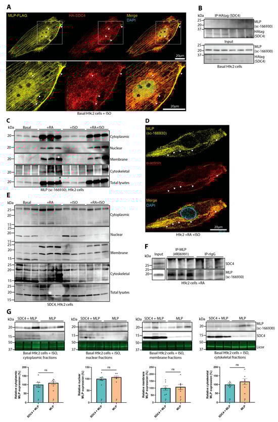 Syndecan-4 does not bind directly to MLP in H9c2 cells. (A) Representative immunofluorescence of MLP-FLAG (yellow) and HA-syndecan-4 (red) in H9c2 cells stimulated with ISO. The cell nucleus was stained with DAPI (cyan). Negative control images are shown in Supplementary Figure S3B. (B) H9c2 cells were transfected with HA-SDC4 and untagged MLP at basal conditions, harvested in lysis buffer, and immunoprecipitated using anti-HA (SDC4). A possible co-precipitation of MLP was analyzed with an antibody against MLP. Lysate inputs are given in the two lowermost panels (n = 6). (C) Immunoblot analysis of MLP in cytoplasmic-, nuclear-, membrane-, and cytoskeletal-enriched H9c2 cell fractions at basal conditions +/− ISO, or in the presence of retinoic acid (+RA) +/− ISO (n = 6). (D) Immunofluorescence of endogenous MLP (yellow) and sarcomeric α-actinin (red) in H9c2 cells differentiated in the presence of retinoic acid (+RA) and treated with 25 µM ISO. The cell nucleus was stained with DAPI (cyan). (E) Immunoblot analysis of syndecan-4 in cytoplasmic-, nuclear-, membrane-, and cytoskeletal-enriched H9c2 cells at basal conditions +/− ISO or in the presence of RA +/− ISO (n = 6) (specificity of bands is shown in Supplementary Figure S2E). (F) Lysates from H9c2 cells differentiated with RA were harvested in lysis buffer and subjected to immunoprecipitation using anti-MLP (antibody epitope mapped to aa 169–194 in the extreme C-terminus, Supplementary Figure S1A) and subsequent immunoblotting of SDC4 (n = 6). Lysate input is given in the left most panels. (G) H9c2 cells transfected with untagged MLP +/− SDC4 were subjected to subcellular fractionation, and syndecan-4- and MLP levels were assessed by immunoblotting. The ~15 kDa shed syndecan-4 fragment was used as a control for overexpression. Subcellular compartment markers were used to show protein loading. Densitometry levels were subsequently quantified (n = 7–13). All values in (G) are presented as mean percentages ± SEM, normalized to subcellular compartment markers, and MLP was thereafter related to SDC4 + MLP. Differences in MLP protein levels were tested with Mann–Whitney U tests due to non-normal distribution analyzed by Shapiro–Wilk testing (ns, not significant).