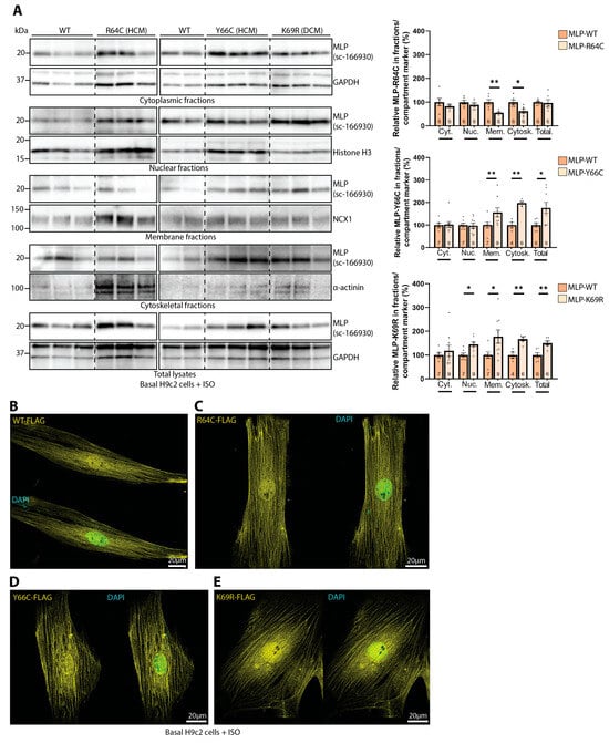 Next, we tested whether HCM- or DCM-associated MLP mutations could have any effect on the subcellular localization of MLP. Since mutations located in the LIM1 domain have previously been found to be prone to degradation due to destabilized protein folding [44], we chose the human mutations located in the NLS, R64C, and Y66C (HCM) as well as K69R (DCM) for further analyses. H9c2 cells were transfected with mutated MLP (untagged) and stimulated with 25 µM ISO for 24 h prior to harvest, as we have previously shown that ISO contributes to the nuclear translocation of MLP in H9c2 cells [14]. Subcellular fractions and total RIPA lysates were immunoblotted for MLP (Figure 4A, left panels) using an antibody recognizing an epitope outside the mutated region (Supplementary Figure S1C, epitope mapped to amino acids 73–104). Subsequent densitometry quantification revealed that the HCM-associated mutation MLP-R64C was decreased in the membrane- and cytoskeletal-enriched fractions (Figure 4A, right and left panels, MLP-R64C vs. MLP-WT). In contrast, expression of the MLP-Y66C (HCM) and MLP-K69R (DCM) variants was increased in the membrane- and cytoskeleton-enriched fractions, as well as in the total lysates, compared to MLP-WT (Figure 4A, right and left panels, MLP-Y66C and -K69R vs. MLP-WT). MLP-K69R also had higher levels of MLP in the nuclear-enriched fraction (Figure 4A, right and left panels, MLP-K69R vs. MLP-WT). Interestingly, the DCM-associated MLP-K69R mutation has been reported to have an increased perinuclear localization in C2C12 cells compared to a widespread localization of MLP-WT [34]. In the H9c2 cells transfected with FLAG-tagged MLP-WT or mutated MLP and stimulated with ISO 24 h prior to fixation, MLP-WT was mainly localized in the nuclear region and striations throughout the cell (Figure 4B). The two HCM-associated mutations, MLP-R64C and MLP-Y66C, and the DCM-associated mutation, MLP-K69R, also localized to the nuclear region and cell striations, much like MLP-WT (Figure 4C–E). Consistent with the fraction analysis, there was also a tendency for the increased nuclear region staining of MLP-K69R.