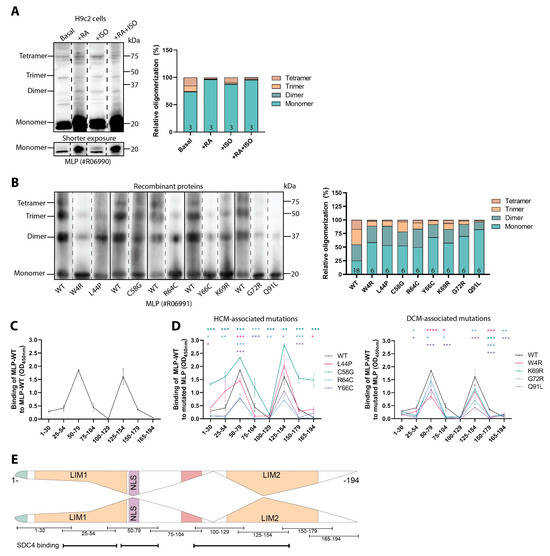 Mutations in MLP alter its oligomerization potential. (A) H9c2 cells treated with +/− retinoic acid (RA) +/− isoprenaline (ISO) and harvested in lysis buffer were subjected to immunoblotting of MLP under native conditions (left panel, dotted line indicates representative lanes are a montage from the same exposed blot). Oligomers of MLP-WT are shown as a percentage of the total MLP detected by densitometry quantification (right panel, n = 3). (B) Recombinant WT or mutated 6xHis-MLP proteins were analyzed by native immunoblotting to measure oligomerization levels (left panel, dotted line indicates representative lanes are a montage from the same exposed blot). Monomers and oligomers for WT and each MLP mutation are shown as a percentage of the total MLP level detected by densitometry quantification (right panel, n = 6–18). Percentage values ± SEM and statistical analyses are given in Supplementary Table S1. (C) An ELISA-based assay coated with full-length recombinant 6xHis-MLP-WT protein, incubated with biotinylated overlapping MLP-WT peptides as potential binding partners (n = 8). (D) An ELISA-based assay coated with eight recombinant 6xHis-MLP mutated proteins, incubated with biotinylated overlapping MLP-WT peptides as potential binding partners (n = 8). Signals from wells coated with PBS only were subtracted from experimental wells (C,D). Binding of MLP-WT peptides to recombinant 6xHis MLP-WT or MLP mutated proteins are shown as mean ± SEM (C,D). Differences between MLP-WT and mutated MLP for each peptide sequence were tested by Mann–Whitney U tests due to non-normal distribution analyzed by Shapiro–Wilk testing (* p < 0.05, ** p < 0.01, *** p < 0.001, **** p < 0.0001) (D). (E) An illustration of MLP self-association results obtained from (C). Peptide sequences and syndecan-4 binding sites identified in Figure 2 are annotated beneath the illustration. Illustrative self-association assumes symmetrical 1:1 binding, which we have not confirmed.