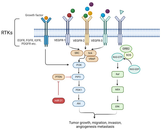 Figure 1. The Effect of miR-21 on the PTEN/AKT Signaling Pathway. By inhibiting PTEN, miR-21 indirectly promotes the AKT pathway to increase cell growth, angiogenesis, and cellular migration. (Figure created using Biorender.com accessed on 22 May 2024).