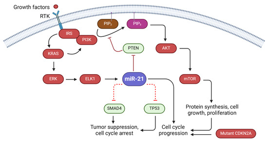 Figure 3. Relationship of miR-21 with KRAS, PTEN, SMAD4, and TP53. The expression of ELK1 enhances miR-21 expression, which leads to downregulation of SMAD4, PTEN, and TP53, inhibiting tumor suppressive functions. The increased expression of miR-21 and mutant CDKN2A promotes cell cycle progression and cellular progression. (Figure created using Biorender.com accessed 23 May 2024).