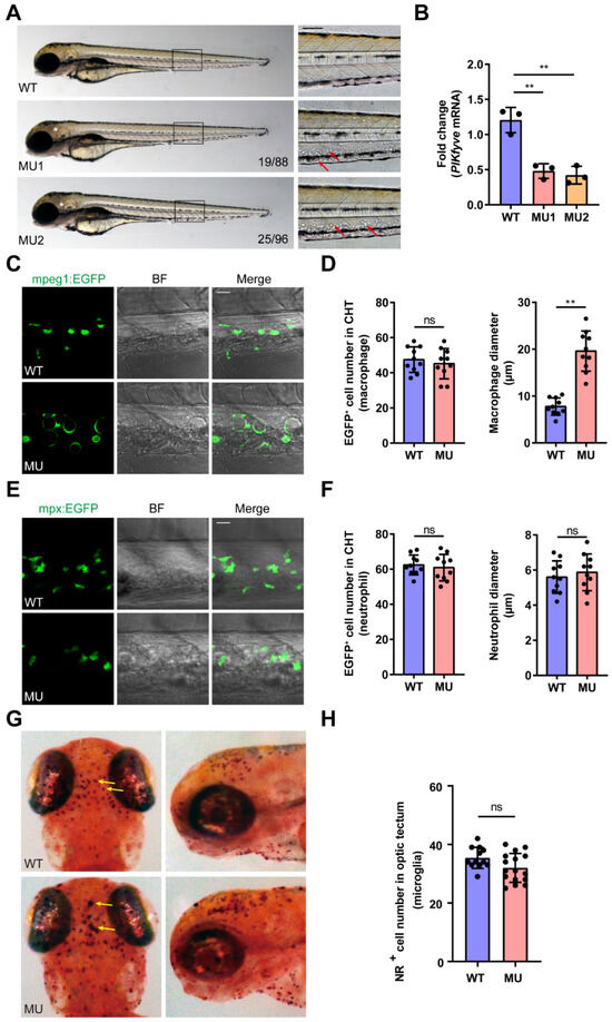 Defects in macrophages in PIKfyve mutant zebrafish embryos. (A) Representative images of WT and MU embryos at 3 dpf. The arrows show the cells with giant vacuole-like structures in the CHT. Cellular death in the mutant brains was evidenced by grey tissue (asterisk). (B) The relative expression levels of PIKfyve in the WT zebrafish and the homozygous mutants (MU1, MU2) were quantified by RT-qPCR. The data were analyzed by 2−∆∆CT method and ꞵ-actin was used as an internal control (** p < 0.01). (C–F) PIKfyve mutation was introduced into transgenic zebrfish lines in which macrophages (mpeg1:EGFP) (C,D) or neutrophils (mpx:EGFP) (E,F) were respectively highlighted with EGFP. In the mutant embryos, the macrophages were enlarged with giant vacuoles, while the neutrophils appeared normal. Scale bar, 20 µm. (D) Quantification of macrophage cell number (left panel) and macrophage diameter (right panel) in the CHT (ns, non-significant; ** p < 0.01). (F) Quantification of neutrophil cell number (left panel) and neutrophil diameter (right panel) in the CHT (ns, non-significant). (G,H) NR staining of microglia in WT siblings and PIKfyve mutants at 3 dpf. (G) Dorsal and lateral view of the microglia in the optic tectum of WT and MU larvae at 3 dpf stained with NR. The yellow arrows show the microglia stained with NR. (H) Quantification of NR-positive microglia cell number in the optic tectum of WT and MU larvae at 3 dpf (ns, non-significant).