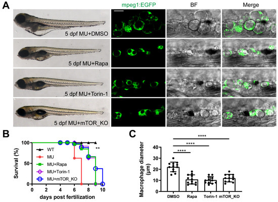 Zebrafish were maintained as previously described [30]. Research on animals was performed with the approval of the animal ethics committee of Guangzhou Institutes of Biomedicine and Health, CAS. Wild-type (WT) TU, PIKfyve mutant (MU), and the following transgenic zebrafish lines were used in this study: Tg(mpeg1:EGFP), Tg(mpx:EGFP). Transgenic zebrafish lines were purchased from the Chinese Zebrafish Resource Center in Wuhan, China. Embryos were grown at 28.5 °C and kept under anesthesia with fish water containing 0.02% Tricaine (3-aminobenzoic acid ethyl ester, Sigma, St. Louis, MO, USA, E10521) during imaging; 0.003% PTU (1-phenyl-2-thiourea, Sigma, St. Louis, MO, USA, P7629) was added in fish water from 24 h post fertilization (hpf) to prevent pigment formation. The CRISPR/Cas9 system was used to generate PIKfyve and mTOR knockout zebrafish lines. The guide RNA(gRNA) targeting sequences were designed with the online tool CRISPRscan (https://www.crisprscan.org/ accessed on 4 March 2019) and are listed in Supplementary Materials Table S1. Primers for genotyping are listed in Supplementary Materials Table S2. The pCS2-nCas9n plasmid (Addgene Watertown, MA, USA, Plasmid #47929) was used to synthesize a zebrafish-codon-optimized Cas9 mRNA. To generate founders, 100 pg of gRNA and 300 pg of Cas9 mRNA were co-injected into one-cell-stage embryos. After incubation at 28.5 °C for 24 h, the genomic DNA was extracted from 30 injected embryos by heating the embryos at 94 °C for 20 min in lysis solution (50 mM NaOH). The reaction was terminated by adding 1/10 volume of 1 M Tris-HCl (pH 8.0). For PIKfyve mutant genotyping, DNA fragment was amplified from genomic DNA, and the PCR product was subjected to SfaNI digestion. F0 embryos with the highest editing efficiency were raised to sexual maturity, and heterozygous F1 fish were obtained and identified from the offspring of F0 fish using DNA sequencing. F1 fish carrying the same mutation were crossed to generate F2 homozygous mutant fish.