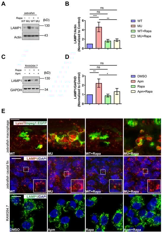 Rapamycin treatment ameliorates the lysosomal defects induced by PIKfyve deficiency in vivo and in vitro. (A–D) Western blot analysis showing the rapamycin treatment restored the elevated LAMP1 level induced by PIKfyve deficiency in zebrafish (A,B) and RAW264.7 cells (C,D). (B) and (D) are densitometric analysis of phosphorylation status of 4E-BP1 and S6K in (A) and (C), respectively (ns, non-significant; * p < 0.05, ** p < 0.01, *** p < 0.001; one-way ANOVA). (E) Lysotracker and LAMP1 staining in zebrafish and RAW264.7 cells. The Lysotracker/LAMP1-positive vacuoles were significantly enlarged in PIKfyve mutant cells and in Apm-treated cells, which were ameliorated by rapamycin treatment.