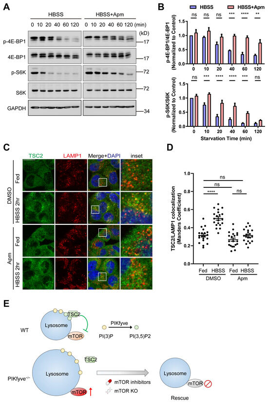 TSC2 is a critical negative regulator of mTOR signaling. TSC2 translocates to lysosome to inactivate mTOR in response to a variety of cellular stresses including starvation, osmostress, and energetic stress [42]. Previous works suggest that TSC2 lysosomal translocation and subsequent inactivation of mTOR upon starvation depend on PIKfyve and its lipid product PI(3,5)P2 [29]. To achieve a better understanding of the molecular mechanisms of PIKfyve regulation of mTOR signaling, we investigated the lysosomal recruitment of TSC2 during starvation-induced mTOR inactivation. In line with previous reports [29,42], in control cells treated with DMSO vehicle, starvation led to the relocalization of TSC2 to the LAMP1-positive lysosomal compartments. In contrast, TSC2 remained diffusely distributed in the cytoplasm in Apm-treated cells, even upon starvation (Figure 6C,D).
