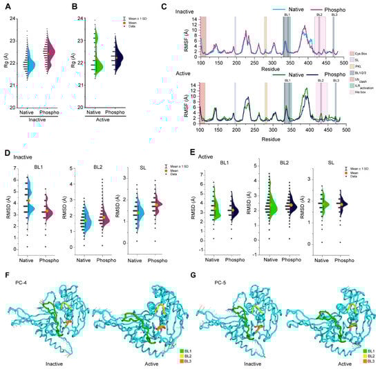 Effect of Ser432 phosphorylation on the conformational dynamics of USP14. Changes in overall conformational dynamics of USP14 in both native and phosphorylated forms were analyzed by radius of gyration (Rg), which were compared and shown in half-violin plots for both (A) inactive and (B) active states. (C) RMSF analysis in line plots shows the changes in residual fluctuation between the native and phosphorylated USP14 for both inactive (upper plot) and active (bottom plot) states. (D,E) Conformational changes in the inhibitory network of blocking loops (BL1, BL2, and SL) by phosphorylation in the inactive and active states were highlighted by RMSD analysis shown in half-violin plots, respectively. In all half-violin plots (including A,B,D,E), each single data point, the standard deviation (SD), and the average are shown by the black dot, error bars, and orange circle, respectively. (F,G) The porcupine plots highlight the contributions of PC4 and PC5 to phospho-inactive and active USP14, showing the differences in directed motion in the inhibitory network of blocking loops. The degree of atomic displacement from high to low is expressed by each color of mod vectors from red to blue, respectively.