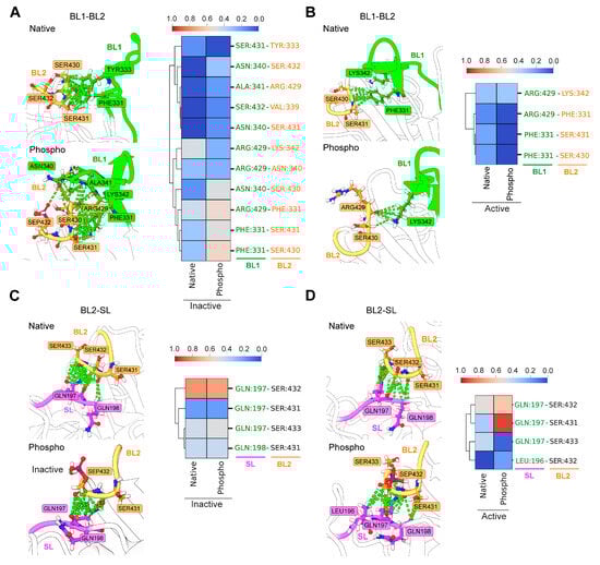Inter-residual interactions between the loops determine the rearrangement of BL1 and BL2, directing toward either repression or derepression of USP14 activity [19]. Therefore, it is essential to analyze the shifts in the interactions among the loops due to phosphorylation. Examining the frequency of the non-bonded interactions between BL1 and BL2 in the inactive state (Figure 4A) revealed that phosphorylation increased the interloop interactions, especially by Phe331 and Asn340, which made contact with Arg429, Ser430, and Ser432, suggesting that phosphorylation highly influences the interloop communication of BL1 and BL2. On the other hand, phosphorylation in the active state shows a lower frequency of contact formation between residues of BL1 and BL2 (Figure 4B).