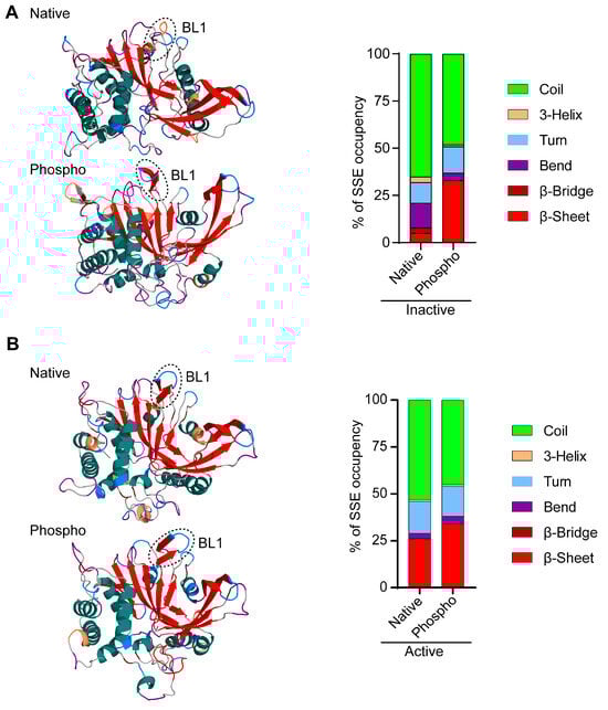 As PCA analysis evidenced substantial change in conformational dynamics of BL1 by phosphorylation in both inactive and active USP14, we dissected gross variations in the secondary structure of the BL1 loop during the simulation by using the DSSP algorithm [37], which reveals many frames of each residue constituting a 310-helix, α-helix, β-strand, unstructured strand, loop, or bend. Figure 5A shows the representative structures found in the highest population in the MD simulation, where BL1 in the native inactive structure of USP14 does not show any secondary structure formation. However, the phosphorylated USP14 inactive structure strikingly conferred the presence of a β-sheet, which occupies around 33% of the total SSE, substantially higher than the native form of inactive USP14. As such, phosphorylation reduced the propensity for coil, bend, and β-bridge formation in the BL1 loop. Notably, BL1 in native or phosphorylated active USP14 already forms the β-sheet; thus, only minor differences exist in their β-sheet occurrences (Figure 5B).
