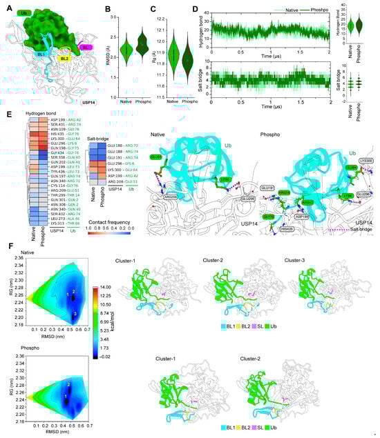 To reveal the effect of phosphorylation on the conformational dynamics of the USP14-Ub complex, the analysis of the free energy landscape (FEL) for both native and phosphorylated USP14-Ub complexes was further incorporated by considering RMSD and Rg as reaction coordinates 1 and 2, respectively (Figure 6F). By differentiating between the thermodynamic and kinetic properties of the native and phosphorylated USP14-Ub complexes during simulation, FEL provides a more precise representation of the time- and energy-dependent protein conformational space [41]. As shown in the contour map in Figure 6F, black and dark blue regions indicate energetically favorable protein conformations having stable lowest energy states, whereas the native USP14-Ub complex showed three energy-minima basins. In comparison, the phosphorylated complex demonstrated only two major energy-minima basins. In the FEL of the native USP14-Ub complex, most of the conformers were concentrated in cluster 2, followed by 3 and 1. On the other hand, clusters 1 and 2 in the phosphorylated USP14 complex contained the majority of conformers, although they tend to share the same structural characteristics. This observation indicates that phosphorylation affects the binding stability of the complex. Representative conformers from the individual clusters in native and phosphorylated complexes revealed substantial differences in conformational changes in BL1, where BL1 remained closer to the Ub and BL2 in all clusters of the native USP14 complex. In the clusters of phosphorylated USP14, BL1 was found more outward from the USP14 catalytic triads (Figure 6F).