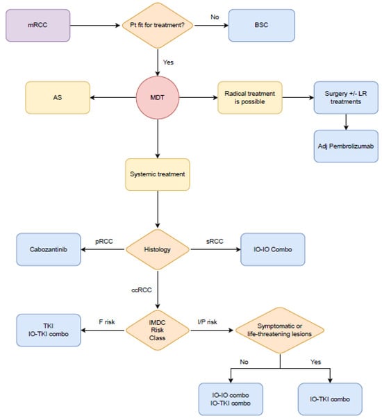 Bloise, F.; Manfredi, F.; Zatteri, L.; Dima, G.; Carli, C.; Di Vita, R.; Olivieri, M.; Sammarco, E.; Ferrari, M.; Salfi, A.; et al. First-Line Treatments and Management of Metastatic Renal Cell Carcinoma Patients: An Italian Interdisciplinary Uro-Oncologic Group Algorithm. Cells 2024, 13, 961. https://doi.org/10.3390/cells13110961
