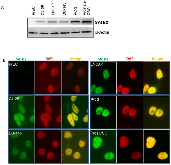 We first compared the expression of SATB2 in human normal prostate epithelial cells (PrEC), prostate cancer cell lines (C4-2B, LNCaP, DU-145, and PC-3), and prostate CSCs using Western blot analysis and immunocytochemistry. As shown in Figure 1A, SATB2 is not expressed in PrECs. However, it is highly expressed in prostate cancer C4-2B, LNCaP, DU-145, and PC-3 cell lines, and prostate CSCs. Interestingly, the expression of SATB2 was highest in CSCs. A similar expression pattern of SATB2 was observed by immunocytochemistry (Figure 1B). These data suggest that the expression of SATB2 is tightly regulated in prostate cancer cells and it may have a role in prostate malignancy.