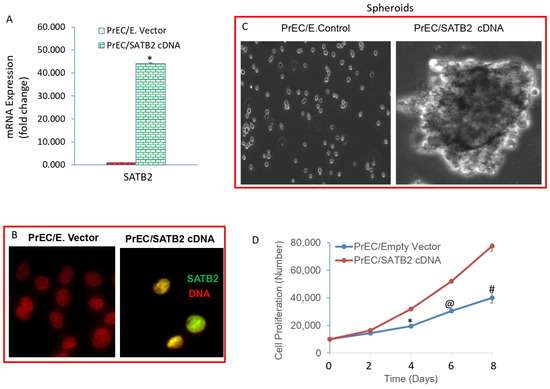 Overexpression of SATB2 in PrECs results in spheroid formation and enhances cell proliferation. (A) Expression of SATB2 mRNA. PrECs were transduced with lentiviral particles expressing either Empty Vector or SATB2 cDNA. SATB2 expression was measured by the qRT-PCR. Data represent mean (n = 4) ± SD. * = significantly different from the respective Empty Vector group, p < 0.05. (B) Expression of SATB2 protein by immunocytochemistry. PrECs were transduced with lentiviral particles expressing either Empty Vector or SATB2 cDNA. SATB2 expression was measured by immunocytochemistry. Note: No expression of SATB2 protein was detected in PrEC/Empty Vector group. (C) Spheroid formation in suspension. PrEC/Empty Vector and PrEC/SATB2 cells were grown in suspension for one week in an ultra-low attachment plate in a defined stem cell culture medium. Spheroid pictures were taken with a microscope. (D) Cell proliferation of PrEC/Empty Vector and PrEC/SATB2 groups was measured for 8 days. Data represent mean (n = 4) ± SD. *, @, and # = significantly different from respective Empty Vector group, p < 0.05. Magnification 40×.