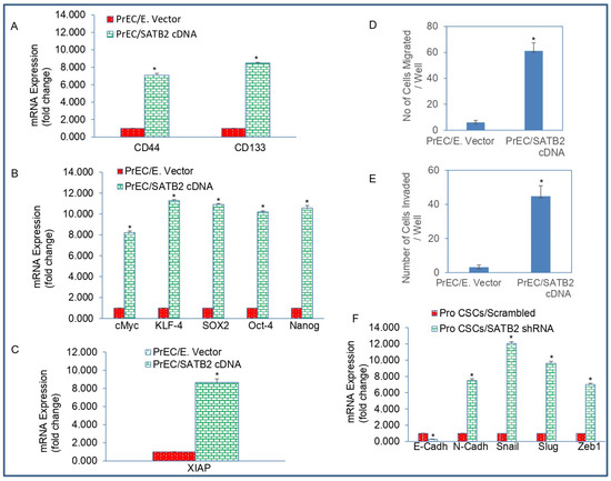 Overexpression of SATB2 in PrECs induces stemness. (A) RNA was isolated and the expression of stem cell marker CD44 and CD133 was measured by qRT-PCR analysis. Data represent mean (n = 4) ± SD. * = significantly different from PrEC/Empty Vector group (p < 0.05). (B) Expression of pluripotency-maintaining factors. RNA was isolated and the expression of cMYC, KLF4, SOX2, OCT4, and NANOG was measured by qRT-PCR analysis. Data represent mean (n = 4) ± SD. * = significantly different from PrEC/Empty Vector group (p < 0.05). (C) Expression of XIAP. RNA was isolated and the expression of XIAP was measured by qRT-PCR analysis. Data represent mean (n = 4) ± SD. * = significantly different from PrEC/Empty Vector group (p < 0.05). (D) Transwell migration assay. Transwell migration assay was performed as described in Section 2. Data represent mean ± SD. * = significantly different at p < 0.05. (E) Transwell invasion assay. Transwell invasion assay was performed as described in Section 2. Data represent mean ± SD. * = significantly different at p < 0.05. (F) RNA was isolated and the expression of EMT-related genes E-CADHERIN, N-CADHERIN, SNAIL, SLUG, and ZEB1 was measured by qRT-PCR analysis. Data represent mean (n = 4) ± SD. * = significantly different from PrEC/Empty Vector group (p < 0.05). Gene expression of Empty Vector was normalized to 1.