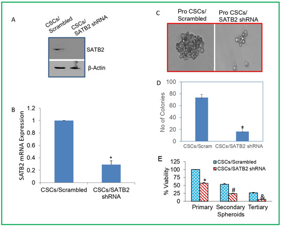 Prostate CSCs are capable of cancer initiation, progression, and metastasis, and they express stem cell markers and pluripotency-maintaining factors [44,45,46,47]. We therefore sought to examine whether inhibition of SATB2 in prostate CSCs by shRNA technology inhibits stem cell properties. We examined the effects of inhibiting SATB2 by shRNA in CSCs on spheroid formation, colony formation, cell viability, and markers of stem cells and pluripotency/self-renewal. We completed the transduction of prostate CSCs with lentiviral particles expressing SATB2 shRNA inhibited protein and mRNA expression of SATB2 (Figure 4A,B). We next examined the effects of inhibiting SATB2 on spheroid formation. SATB2 knockdown in prostate CSCs inhibited spheroid formation (Figure 4C).