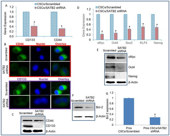 SATB2 shRNA inhibits markers of stem cells, pluripotency/self-renewal, and cell survival/proliferation. (A) Expression of stem cell markers. Prostate CSCs were transduced with lentiviral particles expressing either scrambled or SATB2 shRNA. RNA was isolated and the expression of CD44 and CD133 was measured by qRT-PCR. GAPDH was used as an internal control. Data represent mean (n = 4) ± SD. * = significantly different between groups (p < 0.05). (B) Immunohistochemistry of CD44 and CD133 (40×). Prostate CSCs/Scrambled and Prostate CSCs/SATB2 shRNA cells were stained with either an anti-CD44 antibody or an anti-CD133 antibody. Expression of CD44 and CD133 was examined as described in Section 2. (C) Protein expression of CD44 and CD133. Cell lysates were collected from Prostate CSCs/Scrambled and CSCs/SATB2 shRNA cells. The expression of CD44 and CD133 was measured by Western blot analysis. β-actin was used as a loading control. (D) Expression of pluripotency/self-renewal factors. RNA was isolated from Prostate CSCs/Scrambled and CSCs/SATB2 shRNA cells, and the expression of cMYC, OCT4, SOX2, KLF4, and NANOG was measured by qRT-PCR. GAPDH was used as an internal control. Data represent mean (n = 4) ± SD. * = significantly different between groups (p < 0.05). (E) Protein expression of cMYC, OCT4, and NANOG. Crude proteins were isolated from Prostate CSCs/Scrambled and Prostate CSCs/SATB2 shRNA cells. The expression of cMYC, OCT4, and NANOG was measured by Western blot analysis. β-actin was used as a loading control. (F) Protein expression of BCL-2. Crude proteins were isolated from Prostate CSCs/Scrambled and Prostate CSCs/SATB2 shRNA cells. The expression of BLC-2 was measured by Western blot analysis. β-actin was used as a loading control. (G) RNA expression of BCL-2. RNA was isolated from Prostate CSCs/Scrambled and Prostate CSCs/SATB2 shRNA cells and the expression of BCL-2 was measured by qRT-PCR. GAPDH was used as an internal control. Data represent mean (n = 4) ± SD. * = significantly different between groups (p < 0.05).