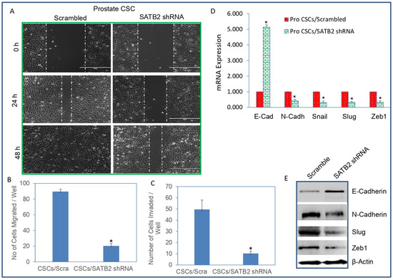 We next examined whether inhibition of SATB2 in CSCs attenuates cell motility, migration, and invasion of prostate CSCs. Prostate CSCs were transduced with either scrambled or SATB2 shRNA lentiviral particles as described above. SATB2 knockdown inhibited cell motility of CSCs compared to that of the scrambled control in a time-dependent manner (Figure 6A). Similarly, SATB2 knockdown inhibited cell migration and invasion of prostate CSCs compared to the scrambled control group (Figure 6B,C). Since SATB2 knockdown inhibited cell motility, migration, and invasion, we sought to examine the molecular mechanism of these events. As shown in Figure 6D, SATB2 knockdown upregulated the expression of E-CADHERIN and inhibited the expression of N-CADHERIN, SNAIL, SLUG, and ZEB1. We next confirmed the expression of EMT regulators by Western blot analysis. SATB2 knockdown upregulated the protein expression of E-CADHERIN and inhibited the protein expression of N-CADHERIN, SLUG, and ZEB1. These data suggest that inhibition of SATB2 suppresses prostate the motility, migration, and invasion of CSCs and modulates the expression of EMT-related genes.