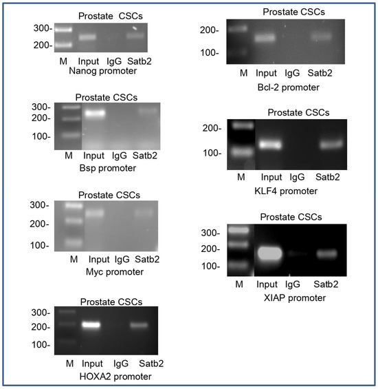 Binding of SATB2 to promoters of NANOG, BSP, MYC, HOXA2, BCL-2, KLF4, and XIAP. Nuclear extracts were prepared from prostate CSCs. Chromatin immunoprecipitation assays were performed to examine the binding of the SATB2 to the promoters of NANOG, BSP, MYC, HOXA2, BCL-2, KLF4, and XIAP in prostate CSCs as described elsewhere [14,16].