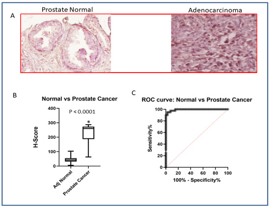 Expression of SATB2 in prostate cancer. (A) Expression of SATB2. Prostate tissues containing adjacent normal and cancerous (adenocarcinoma) tissues were purchased from US Biomax (Denwood, MD, USA) and Cooperative Human Tissue Network (CHTN). The expression of SATB2 was measured by immunohistochemistry. Representative photograph of prostate adjacent normal and cancer tissues. Magnification 40×. (B) H-score of SATB2 expression in human prostate normal and adenocarcinoma tissues. Data represent mean (n = 40) ± SD. * = significantly different from adjacent normal (p < 0.0001). (C) ROC curve. ROC curve of prostate normal and adenocarcinoma tissues.