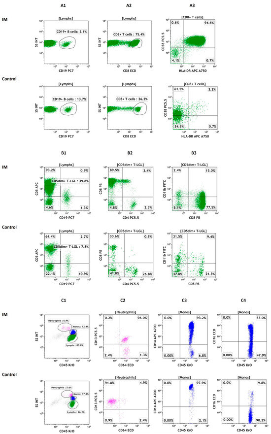 The mean CD8+ T cell HLA-DR+CD38+ expression was much higher in IM than control cases in 10-color flow cytometry analysis (72.2 ± 25 vs. 15.6 ± 21; p = 0.001), indicating the significant activation status of cytotoxic T cells in IM. However, despite the predominance of CD8+ cells in the T-LGL population (81.5 ± 10 vs. 51.7 ± 16.9; p = 0.001), the great majority of T-LGL did not express another activation marker, CD11b (CD8+CD11b– T-LGL at 71 ± 14.7 in IM vs. 28.5 ± 8.8 in the controls; p = 0.001). The contrasting expression of activation markers HLA-DR and CD11b in IM is quite interesting (Figure 1(A3,B3)).
