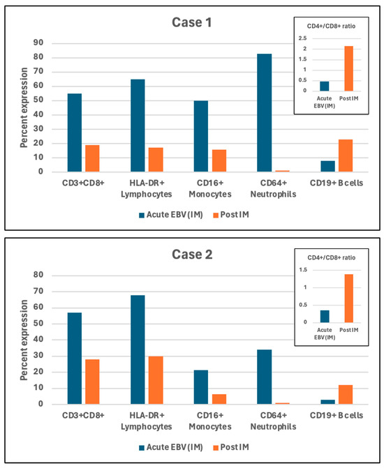 Changes in flow cytometric characteristics in two cases in one month after initial acute EBV infection diagnosis. Both Case 1 and Case 2 show decrease in cytotoxic activated CD3+CD8+ T cells, decreased HLA-DR+ activated lymphocytes, decreased CD16+ intermediate or non-classical monocytes, and striking disappearance of CD64+ neutrophils, increase in B cells as displayed in the bar graph one month post IM compared to that during active phase of EBV infection. Bar graph displays normalization of CD4/CD8 ratio one month post IM.