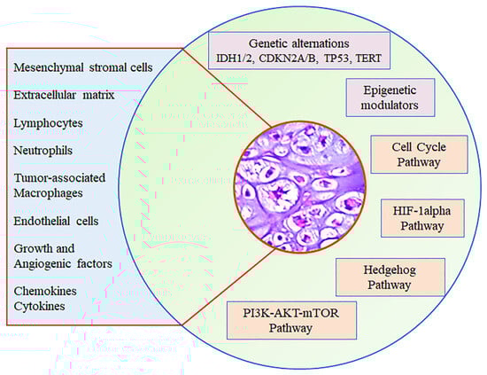Schematic representation of multiple mechanisms by which genetic and epigenetic alterations, dysregulated signaling pathways, as well as soluble and cellular components within the TME, sustain the initiation and progression of chondrosarcomas.