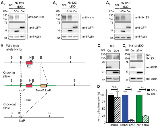 Cultured primary hippocampal neurons from Nx123 conditional knockout (cKO) mice [46] were transduced by lentivirus particles expressing active Cre- or inactive ΔCre-recombinase fused to EGFP at DIV4. Neurons were tested for α-Nx expression at DIV18 by immunoblotting and compared to neurons that contained no floxed α-Nx variants (Figure 1A). All three antibodies tested (Figure 1A1–A3) revealed the presence of α-Nx in wild-type and ΔCre-transduced neurons, and strongly reduced protein levels in Cre-transduced Nx123 cKO neurons, indicating an effective deletion of α-Nxs. This finding is consistent with the reduced mRNA levels in the same mouse model [46] and the efficient removal of β-Nx protein upon Cre recombination in a related line [45]. To compare these Nx123 cKO neurons to neurons lacking only the single Nx1α variant, which is prominently expressed in the hippocampus [48], a knock-in/conditional knockout mouse line of Nx1α was generated, in which the first coding exon of the neurexin-1 gene is flanked by loxP sites (Figure 1B). In hippocampal neurons cultured from these Nx1α cKO mice, Cre recombinase expression also efficiently depleted the α-Nx signal on immunoblots in comparison to cultures infected by ΔCre-expressing lentivirus (Figure 1C2) in contrast to neurons that contained no floxed α-Nxs (Figure 1C1). The strong reduction in the signal indicated an effective deletion of Nx1α. Moreover, since we used an antibody that recognizes all α-Nx variants, this finding confirms the substantial contribution of the Nx1α isoform to the overall α-Nx protein pool, consistent with earlier mRNA data [48]. The strong reduction in the signal also indicates that the deletion of Nx1α is likely not compensated by other α-Nx isoforms. Quantification of the Nx signal intensities on repeated immunoblots, normalized to the respective control (ΔCre) value (Figure 1D), confirmed the predominance of Nx1α in the cultured hippocampal neurons because the deletion of the single variant reduced the α-Nx signal already by 75% to 25 ± 2% of control (Nx1α cKO Cre), while the deletion of all α-Nxs reduced the signal to 8 ± 3% (Nx123 cKO Cre).