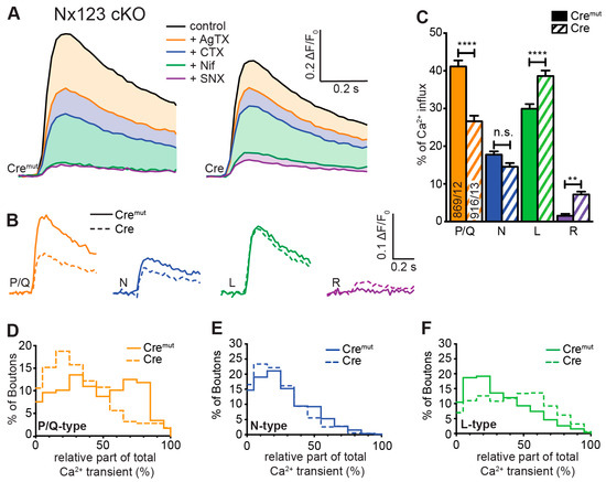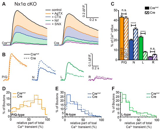 These results suggest that the α-Nx variants are predominantly responsible for regulating the total presynaptic Ca2+ influx. To test if deletion of the single Nx1α variant was already sufficient to reduce the total presynaptic Ca2+ influx, we performed the same experiment using neurons from the newly generated Nx1α cKO mouse line (Figure 2E,F). We found that again the maximum amplitude of Ca2+ transients was smaller in Cre-transduced neurons compared to the control (Nx1α cKO, Cremut: 0.458 ± 0.026 vs. Cre: 0.380 ± 0.025; p < 0.05; Figure 2F). This reduction in Ca2+ transients by 17.0% in neurons lacking only α-Nx is in line with the strong expression of the Nx1α isoform in hippocampal neurons [48], and constitutive deletion of Nx1α has been shown before to cause functional and behavioral deficits [56,57,58]. These data may indicate that the lack of Nx1α is so fundamental that other α-Nx variants, for example, Nx3α [48], cannot fully compensate for the loss at the level of overall Ca2+ influx, emphasizing the role of Nx1α for the presence and function of presynaptic VGCCs. The question arises, however, of whether all VGCC subtypes contribute equally to the reduction in overall Ca2+ influx, or if the individual VGCC subtypes (P/Q, N, L, or R) contribute disproportionally to the effect.