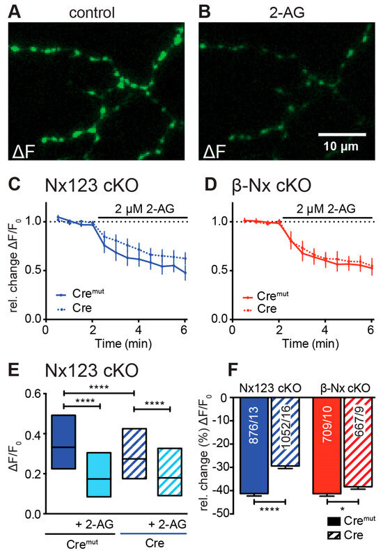Presynaptic VGCCs are modulated by a wealth of metabotropic receptors including the cannabinoid receptor CB1 [61,62]. Strikingly, the endocannabinoid receptor system was recently shown to be modulated by neurexins [44]. Endocannabinoids such as 2-arachidonoylglycerol (2-AG) are lipid-based neurotransmitters that bind to CB1R [63] and thereby allow the retrograde adaptation of synaptic activity [64,65,66,67]. This modulatory process is regulated postsynaptically by on-demand synthesis and degradation of endocannabinoids [68]. Here, we tested the idea that the decrease in presynaptic Ca2+ transients induced by the CB1-receptor agonist 2-AG depends on Nxs. Direct measurements of AP-driven presynaptic Ca2+ transients and subsequent activation of the CB1-receptor with 2-AG resulted in a significant reduction in Ca2+ influx in both control and Nx-deficient neurons as well as in β-Nx-deficient neurons (Figure 5). This reduction in the presynaptic Ca2+ influx by 2-AG was larger in control neurons (Nx123 cKO Cremut: 0.37 ± 0.01; with 2-AG: 0.22 ± 0.01) compared to Nx-deficient neurons (Nx123 cKO Cre: 0.33 ± 0.01; with 2-AG: 0.24 ± 0.01; Figure 5E). The relative change (%) caused by the endocannabinoid 2-AG was significantly lower in the Nx-deficient neurons (Cremut −41.3% ± 1.0% vs. Cre −29.4% ± 1.1%, p < 0.0001; Figure 5F, blue columns), indicating a modulatory role of Nxs in the CB1-receptor signaling cascade. In neurons lacking only β-Nxs, the relative change caused by the addition of 2-AG was much weaker, but still significant (Cremut: −41.3% ± 1.1% vs. Cre: −38.3% ± 1.0%; p = 0.047; Figure 5F, red columns). These data suggest a dominant role of α-Nxs in the Nx-related impact on retrograde endocannabinoid signaling, extending an earlier study describing a dependence solely on β-Nxs [44].