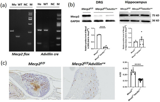 Generation of Mecp2fl/fl Advillincre mice. Female Mecp2 floxed mice were bred with male Advillin-Cre mice to generate Mecp2fl/flAdvillincre mice. (a) Analysis of the PCR products of tail DNA from pups that were produced from crossings between Mecp2fl/flAdvillincre males and females carrying both Mecp2 floxed and Advillin-Cre transgene by agarose gel electrophoresis. Mu: mutant (Mecp2 280 bp, Advillincre 150 bp); WT: wild-type (Mecp2 180 bp, Advillincre 530 bp); NC: negative control; He: heterozygous; M: DNA ladder DL2000; (b) western blot analysis of protein samples prepared from DRG and hippocampus of adult Mecp2fl/fl and Mecp2fl/flAdvillincre mice. Mecp2fl/fl n = 3, Mecp2fl/flAdvillincre n = 6. (c) Mecp2 immunohistochemical analysis of DRG sections from adult Mecp2fl/fl and Mecp2fl/flAdvillincre mice. The brownish yellow particles represent positive protein expression. Scale bar: 200 µm. AOD: Average optical density. **** p < 0.0001.