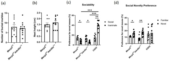 The three-chamber social interaction assay is commonly used to assess both sociability and social recognition/preference in rodents, and it is often used to measure social behavior deficits in mice [37]. Here, it was used to evaluate the effect of Mecp2 in the sensory neuron on social behaviors, and CSDS mice were simultaneously used as the positive control. We found there was no obvious abnormality in Mecp2fl/flAdvillincre mice during the sociability phase. Compared to Mecp2fl/fl mice, Mecp2fl/flAdvillincre mice exhibited a similar duration in the chamber containing the social target or an inanimate target (Figure 3c). During the social novelty phase, Mecp2fl/fl mice and Mecp2fl/flAdvillincre mice also spent a similar time in the chamber with a familiar mouse or an unfamiliar mouse. But the CSDS mice had more time with an inanimate object during the sociability phase (Figure 3d). Interestingly, during the “social novelty preference” session, the preference for the novel mouse increased by 31.19% compared to familiar mice in Mecp2fl/fl mice, while Mecp2fl/fl Advillincre mice increased by 95.11%. It seems that Mecp2fl/flAdvillincre mice displayed a strong preference for the novel mouse.