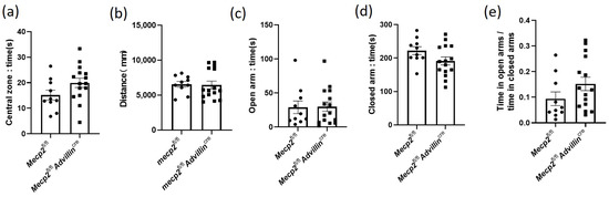 Next, we investigated whether mice harboring or showing the deletion of Mecp2 in the sensory neuron exhibit locomotor/exploratory activities and anxiety-like behavior. Mecp2fl/fl mice and Mecp2fl/flAdvillincre mice were firstly subjected to a 10 min open field test. There was no statistically significant difference in the time in the central zone (Figure 4a) and the overall distance traveled in the open field (Figure 4b) between mutant mice and wild-type mice. Then, an additional measurement of anxiety-like behavior, the elevated plus-maze, was tested in all mice. Consistent with the results of the open field test, Mecp2fl/fl mice and Mecp2fl/fl Advillincre mice had a similar time in both open and closed arms, and there was no significant difference in the ratio of time in open arms to time in closed arms (Figure 4c–e). It is known that mice with anxiety-like behavior spend less time exploring the center of the chamber and travel shorter distances in the open field test and spent less time in the open arms during the elevated plus-maze test as well [38]. These data indicate that the lack of Mecp2 in peripheral sensory neurons does not increase anxiety-like behavior in mice.