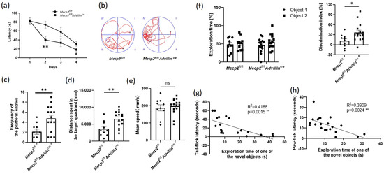 All behavioral experiments were performed between 8 am and 5 pm. All mice were subjected to the behavioral tests at 8 weeks of age in the order shown in Supplementary Figure S1 (Mecp2fl/fl, n = 10; Mecp2fl/flAdvillincre, n = 11–15). The behaviors of open field and Morris water maze were recorded and analyzed by a video-tracking system (ANYmaze, Stoelting Co., Wood Dale, IL, USA). All apparatuses were wiped with water first, then with 75% ethanol, and were allowed to dry before being placed in mice. All animals in this work were euthanized one week after completing all behavioral experiments to collect samples for immunohistochemical and biochemical analyses.