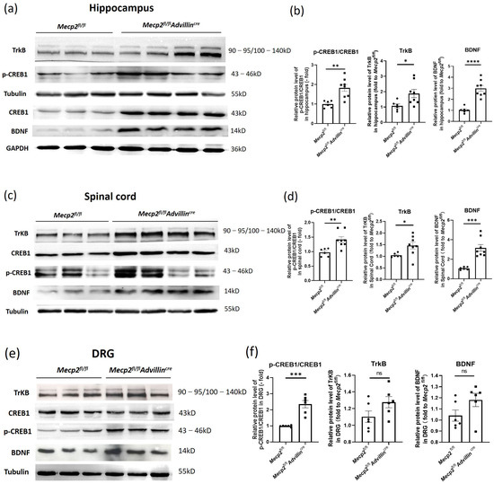 To delve deeper into the neurobiological mechanisms underlying the altered synaptic phenotypes in the hippocampus of Mecp2fl/flAdvillincre mice, we examined the BDNF-TrkB-CREB1 signaling pathway in the hippocampus, spinal cord, and DRG through western blot analysis. Compared to Mecp2fl/fl mice, the protein levels of BDNF, TrkB, and p-CREB1/CREB1 were significantly elevated in the hippocampus and spinal cord of Mecp2fl/flAdvillincre mice (Figure 7a–d). In DRG, the ratio of p-CREB1/CREB1 significantly increased, while the TrkB and BDNF did not change (Figure 7e,f).