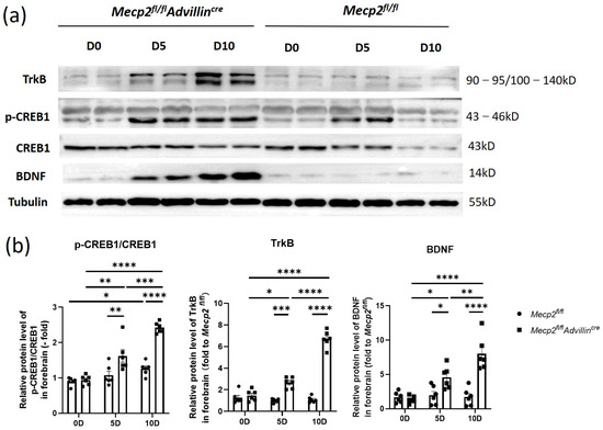 The BDNF-TrkB-CREB1 signaling pathway was activated in forebrain of Mecp2fl/flAdvillincre mice after birth. Protein levels of BDNF, p-CREB1, CREB1, and TrkB in forebrain (a) were determined by western blot. The semi-quantitative protein levels of target genes were normalized to Tubulin (b). Mecp2fl/fl n = 6, Mecp2fl/flAdvillincre n = 8. p value was determined by two-way ANOVA. * p < 0.05, ** p < 0.01, *** p < 0.001, **** p < 0.0001.