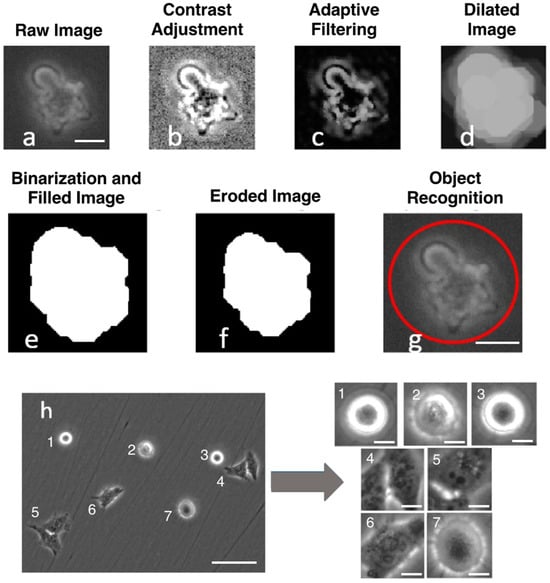 Cell cropping process. (a–f) Single-cell cropping process. (a) Unaltered pre-cropped raw image from the microscope. Scale bar = 10 µm, (b) Contrast adjustment for an improved binarization outcome. (c) Adaptive filtering through a 5 × 5 window. (d) Dilated image to fill in border irregularities. (e) Binarized image with inside filled in. (f) Eroded image to minimize multiple cell detection, areas under 2000 pixels are removed. (g) Cell cropping based on the centroid. Scale bar = 10 µm. The red circle signifies that the object inside (the cell) is detected by the cell cropping process. (h) An example of a raw 20× microscopy image from the BioTek Lionheart FX microscope using previous methods to detect and crop cells into 100 × 100 pixels. Scale bar = 100 µm for uncropped images, 10 µm for cropped images.
