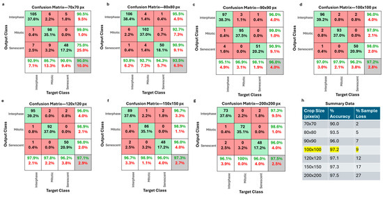 Optimization of cell cropping size. (a–g) Representative confusion matrices of crop sizes varying from 70 × 70 pixels to 200 × 200 pixels. (h) Summary table showing % accuracy and % sample loss for the different crop sizes. Highlighted row is the crop size used for D-MAINS.