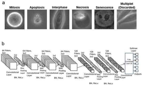 In addition to visual inspection, other cell death probing methods involve biomarker stains and assays. These methods are often costly, inefficient, and qualitative. Stains such as Propidium Iodide (PI) or SYTOX dyes can distinguish between apoptosis and necrosis for cell death. More specifically, SYTOX Green (or PI) is used because it can stain the nucleic acids of cells with compromised plasma membranes, which only applies to necrotic cells. Annexin V was also used for apoptotic labeling, but it is now known that it also stains necroptotic cells [8]. Mitosis can be characterized by DAPI staining of the nucleus; chromosome condensation is a hallmark feature of a cell undergoing mitosis [9]. For senescence, the most common assay for detection is the senescence-associated β-galactosidase (SA-β-gal) assay. This assay is pH sensitive, requires costly reagents, takes considerable time to perform, and is mainly qualitative rather than quantitative [10,11,12]. The cells must also be fixed for the SA-β-gal assay; thus, live imaging for senescent cell dynamics is almost impossible. Overall, staining not only takes additional time and cost to perform, but it also takes up channels that can be used for biomarker detection. For example, suppose a fluorescent fluorescein isothiocyanate (FITC)-based dye is used to detect senescence. In this case, the GFP channel cannot be used to detect other biomarkers that might be important and not easily detectable by morphology. Thus, it is important to develop a label-free method in order to overcome these challenges.