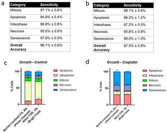 Assessment across different cell lines, treatments, microscopes, and magnifications using D-MAINS. (a) Table of accuracies and sensitivities of each cell status on Ovcar8 cells. (b) Table of accuracies and sensitivities of each cell status on NIH3T3 cells. (c,d) Control (c) and cisplatin-treated (d) Ovcar8 cells were imaged across two different microscopes and analyzed with the D-MAINS algorithm. BioTek Lionheart FX was the original microscope used for the training dataset and images at 20×. Nikon Ti2E was the other microscope used with 10× magnification. Note that Nikon Ti2E was not used to establish the D-MAINS training dataset. Phase contrast (BioTek Lionheart FX) and bright field (Nikon Ti2E) were used for imaging, respectively.