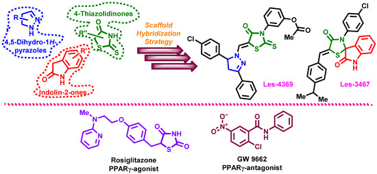 Applied design strategy for 4-thiazolidinone hybrids Les-4369 and Les-3467. Structures of the potential PPARγ-agonist rosiglitazone and PPARγ-antagonist GW9662 used in the experiments.