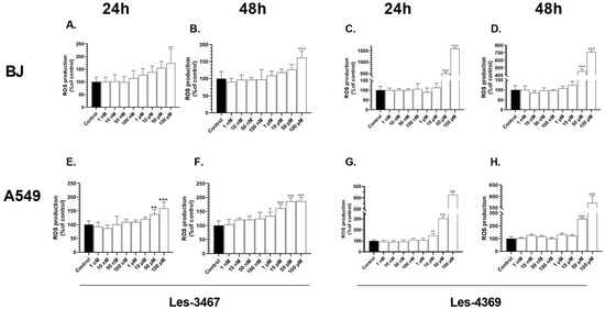 Effects of increasing concentrations of Les-3467 (A,B,E,F) and Les-4369 (C,D,G,H) (1 nM–100 μM) on the ROS production in the A549 and BJ cell lines after 24 h (A,E,C,G) and 48 h (B,F,D,H). The statistical significance of each data point was analyzed by Tukey’s test using one-way ANOVA for each study group; * p < 0.05, ** p < 0.01, and *** p < 0.001, compared with control cells.